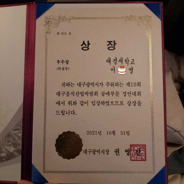 제19회 대구음식산업박람회 페이지 정보 본문 제19회 대구음식산업박람회 공예 부문우수상(대구광역시장상) - 이O영장려상(대구음식산업박람회 조직위원장상 - 송O란, 장O민 전원 입상 모두모두 축하드립니다. 목록 Prev 제19회 대구음식산업박람회 21.11.01 List Next 제19회 대구음식산업박람회 21.11.01