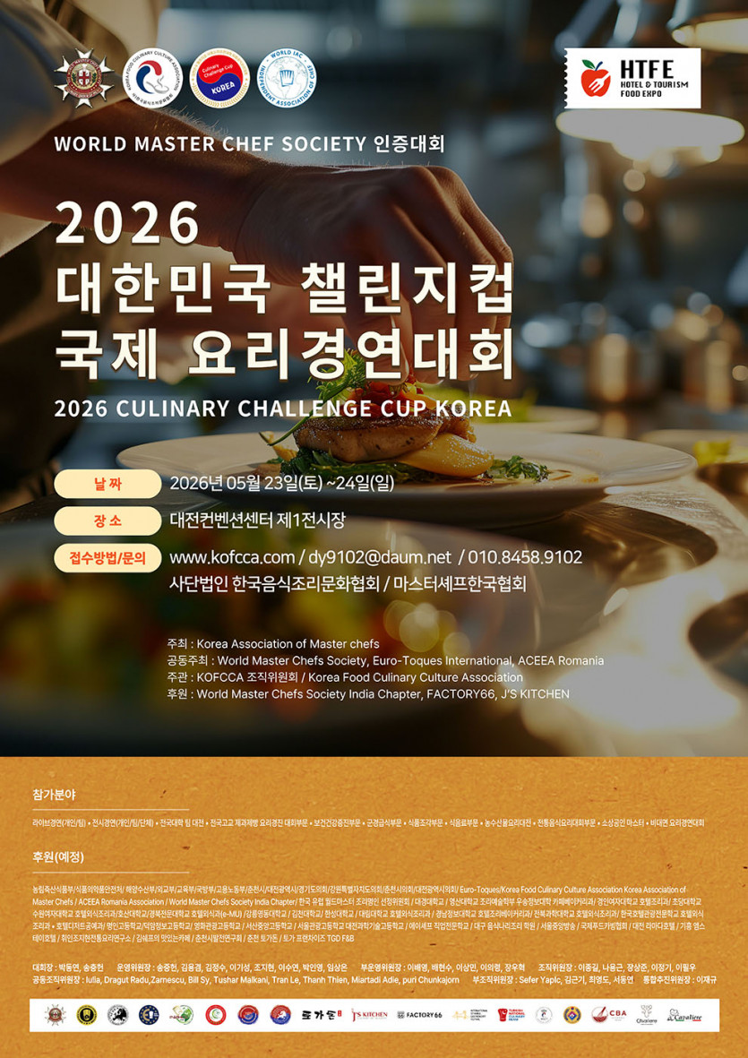 2026 대한민국 챌린지컵 국제요리 경연대회 본문 2026 대한민국 챌린지컵 국제요리 경연대회 첨부파일 챌린지컵 규정집.pdf (1.2M) 0회 다운로드 | DATE : 2026-04-08 12:23:07 List Next 2026년 미국 뚜레주 기업 설명회 26.03.17